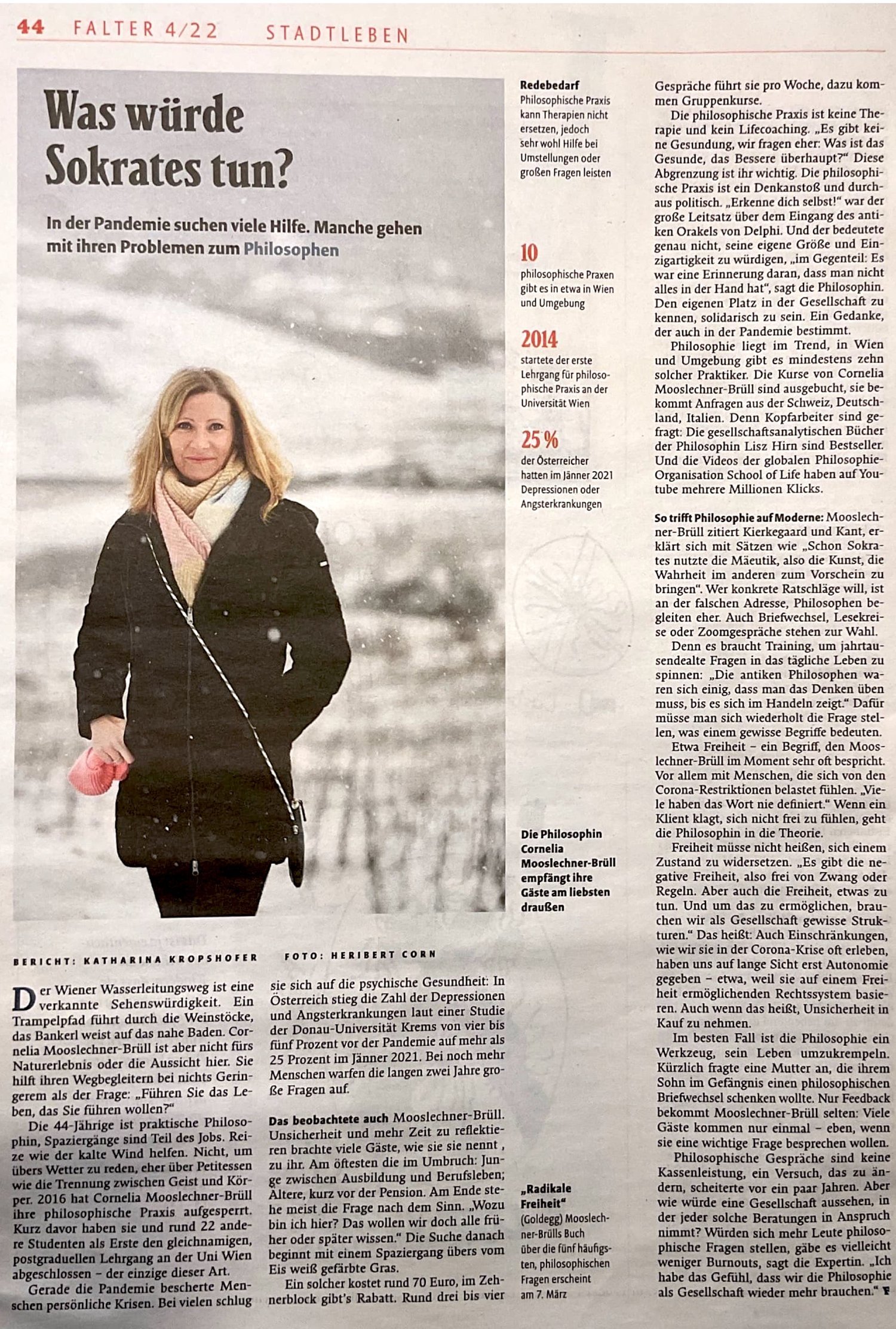 “Was würde Sokrates tun?”, ein Bericht im Falter über meine Philosophische Praxis von Katharina Kropshofer, Falter 4/2022