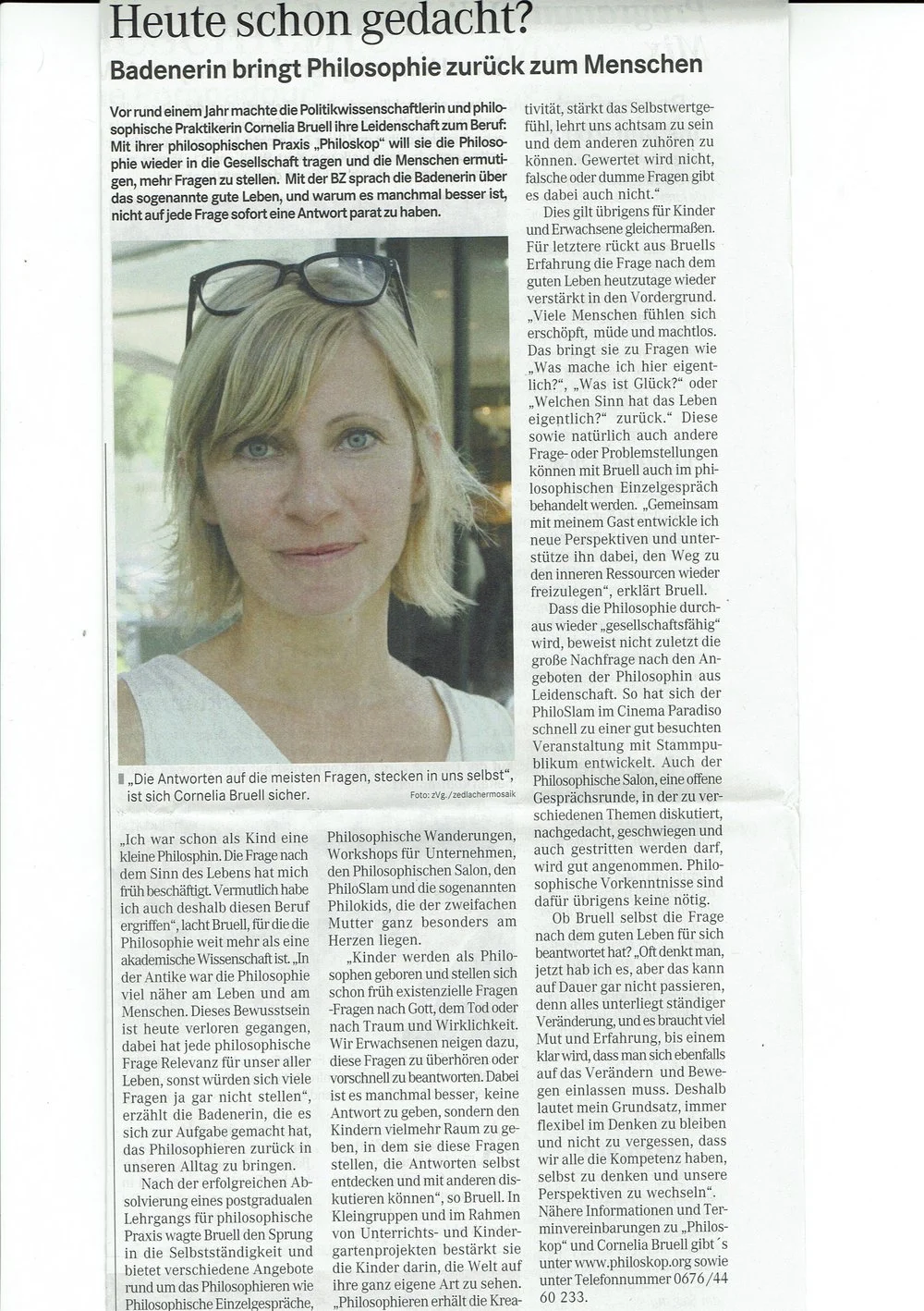 PHILO SLAM, Bericht in den Bezirksblättern über den 3. Philo Slam in Baden, "Philosophie Party im Paradiso